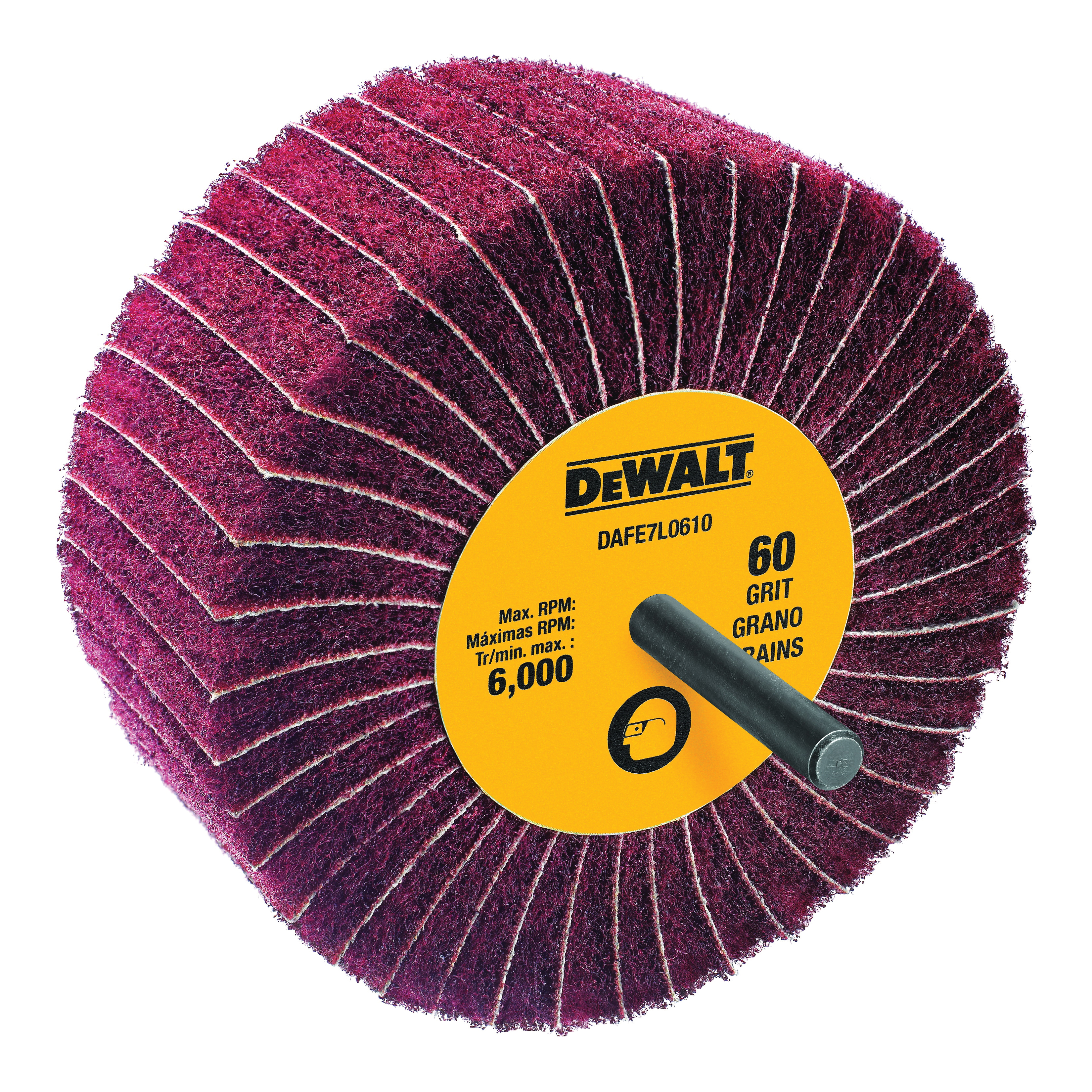 DeWALT HP Coated Flap Wheel, Interleaf Mount, 2 in Wheel Dia, 1 in Face Width, 1/4 in Shank Dia, 60 Grit, Coarse Grade, Aluminum Oxide Abrasive, 6000 rpm Maximum, Arbor Attachment