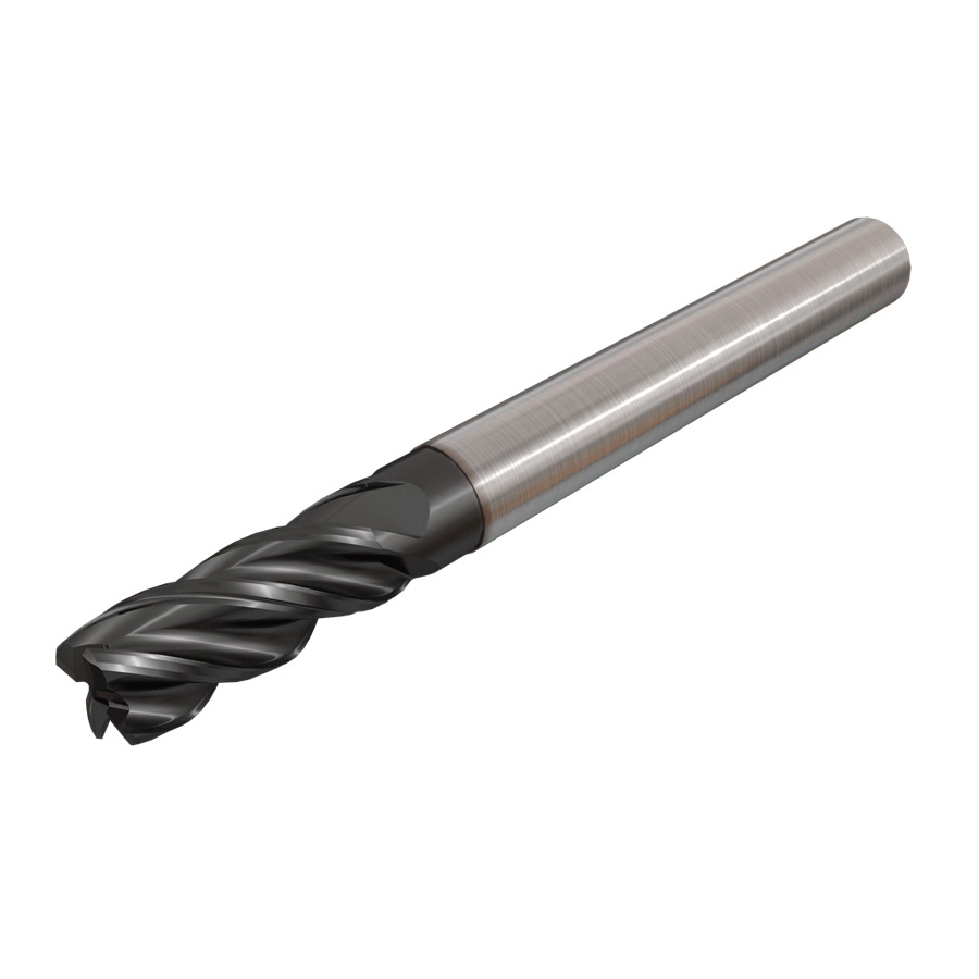 • 4-flute end mills with 38 deg helix, variable pitch for chatter free roughing and finishing operations