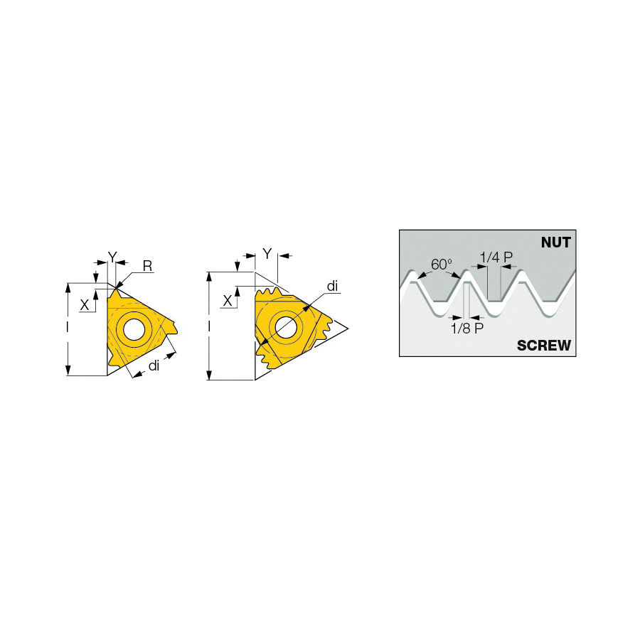 Iscar Threading Insert, Laydown, Series: ISCARTHREAD, 16ERM Insert, 16 Insert, Triangular Shape, External Thread, UN Thread Standard, 16 Threads per Inch, 9.52 mm Inscribed Circle, 3.63 mm Thickness, 16.49 mm Length, ISO Code: 16ERM 16 UN IC908, M Chipbreaker, 0.19 mm Corner Radius, 60 deg Included Angle, Manufacturers Grade: IC908, Right Hand Cutting Direction, Carbide, PVD-TiAlN Coated, Material Grade: H, K, M, P, S