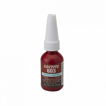 Loctite Retaining Compound, High Strength, Series: 603, Bottle, 10 mL, Composition: Methacrylate Resin, Methacrylate, Hydroxyalkyl Methacrylate, Polyurethane Methacrylate, Acrylic Acid, Alkylphenol Ethoxylate, Cumene Hydroperoxide, Polyglycol Dimethacrylate, Liquid, 10 min Application, 24 hr Curing, Green, Sharp, -65 to 300 deg F, 1.1 Specific Gravity, 212 deg F Flash, 19.26 g/L VOC, 125 cPs Viscosity Rating, 3770 psi Shear Strength