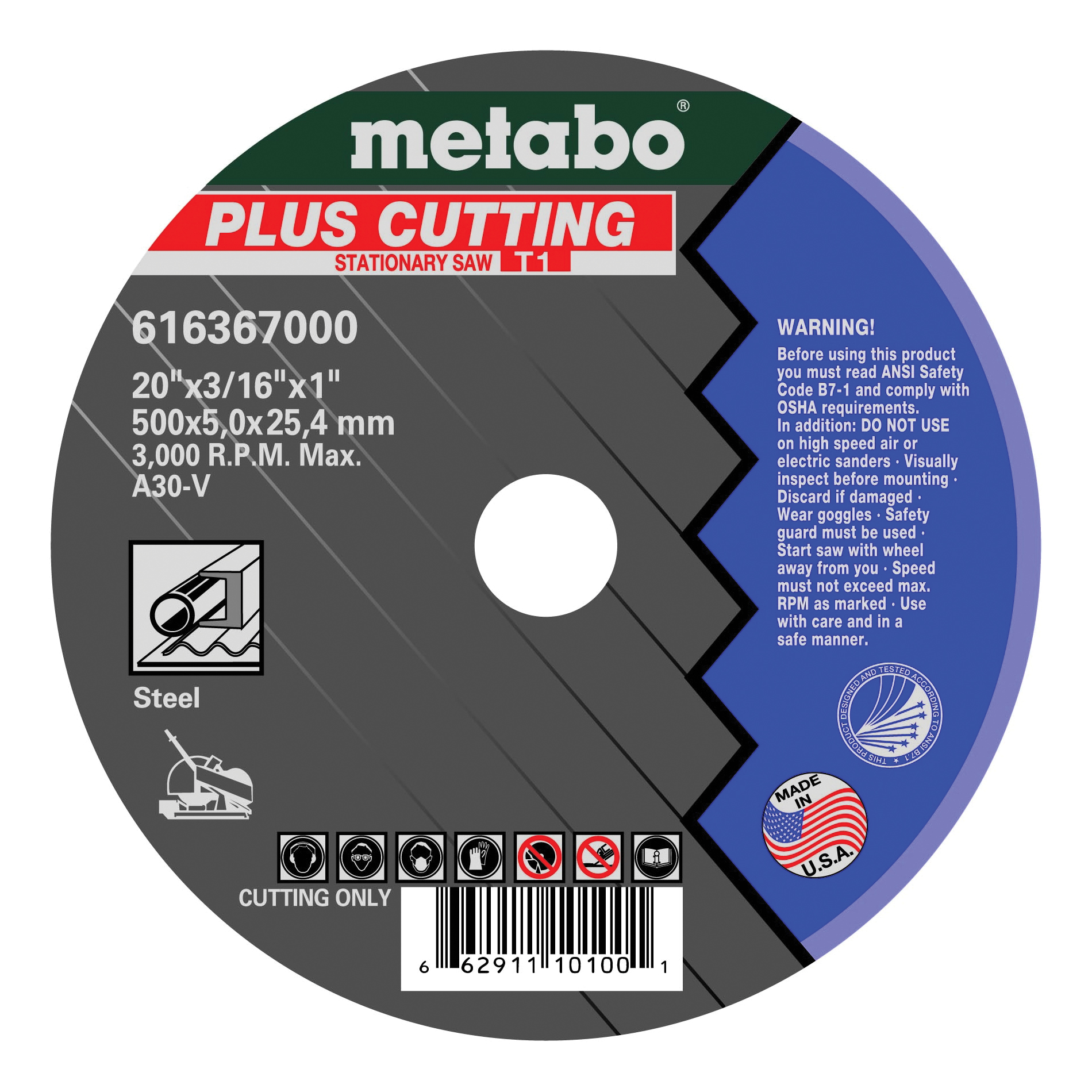 metabo Cut-Off Wheel, Type 1 Straight, Series: Plus, 20 in Wheel Dia, 3/16 in Wheel Thickness, 1 in Center Hole, 30 Grit, Medium Grade, Aluminum Oxide Abrasive, 3000 rpm Maximum, Resin Bond, Applicable Materials: Steel and Ferrous Metals, Wheel Type Number: Type 1, Wheel Hardness: V, For Use With: Stationary Saws