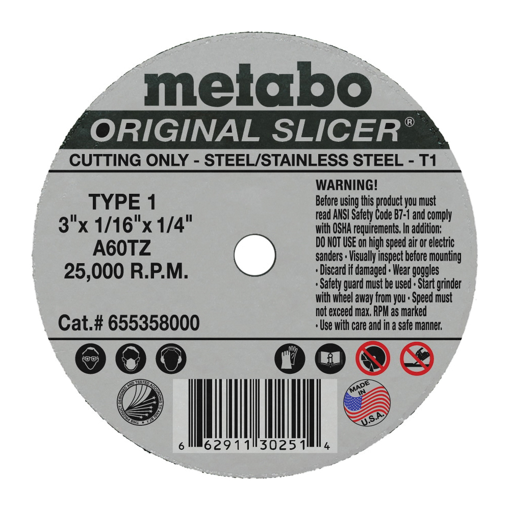 metabo Cut-Off Wheel, Type 1 Straight, Series: Original Slicer, 3 in Wheel Dia, 1/16 in Wheel Thickness, 1/4 in Center Hole, 60 Grit, Medium Grade, Aluminum Oxide Abrasive, 25000 rpm Maximum, Resin Bond, Applicable Materials: Steel, Stainless Steel and Ferrous Metals, Wheel Type Number: Type 1, Wheel Hardness: TZ
