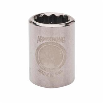 Armstrong Socket, Standard Length, Series, Measurement System, Square Drive, Drive Size, in 3/8, Socket Size, mm 15, 0.969 Overall Length, Opening Depth in, in 0.461, 0.815 Drive End Width, Socket End Width in, in 0.815, Ball Locking, Number of Points, Bolt Clearance Depth, in 0.598, High Alloy Steel, Finish