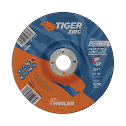 Tiger Depressed Center Grinding Wheel, Performance Line, 6 in Wheel Diameter, 1/4 in Wheel Thickness, 7/8 in Center Hole, Arbor Connector, 24 Grit, Coarse Grade, Zirconia Alumina Abrasive, Wheel Type Number: Type 27, 10200 rpm Maximum, Resin Bond, Applicable Materials: Carbon Steel, Structural Steel, Cast Iron, Steel and Stainless Steel, Wheel Hardness: T, Yes Reinforced, Specifications Met: ANSI B7.1-2010