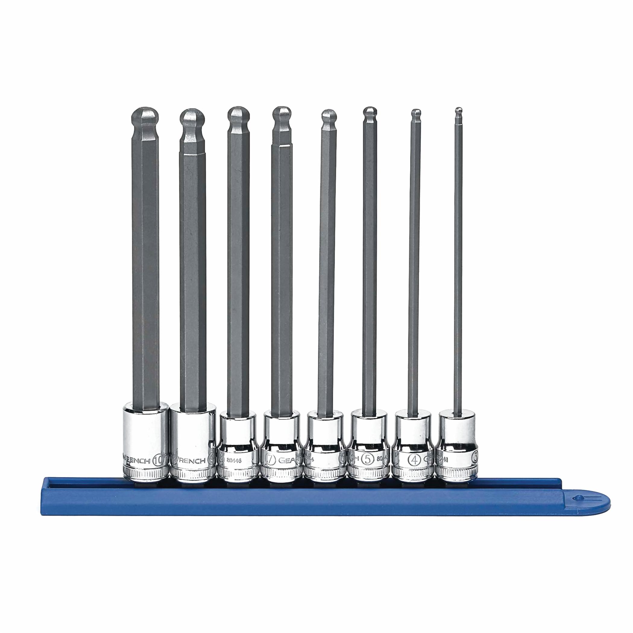 Includes80441 3 mm, 80442 4 mm, 80443 5 mm, 80444 6 mm, 80445 7 mm, 80446 8 mm, 80447 9 mm, 80448 10 mm Long Ball End Hex Bit Socket and Socket Rail