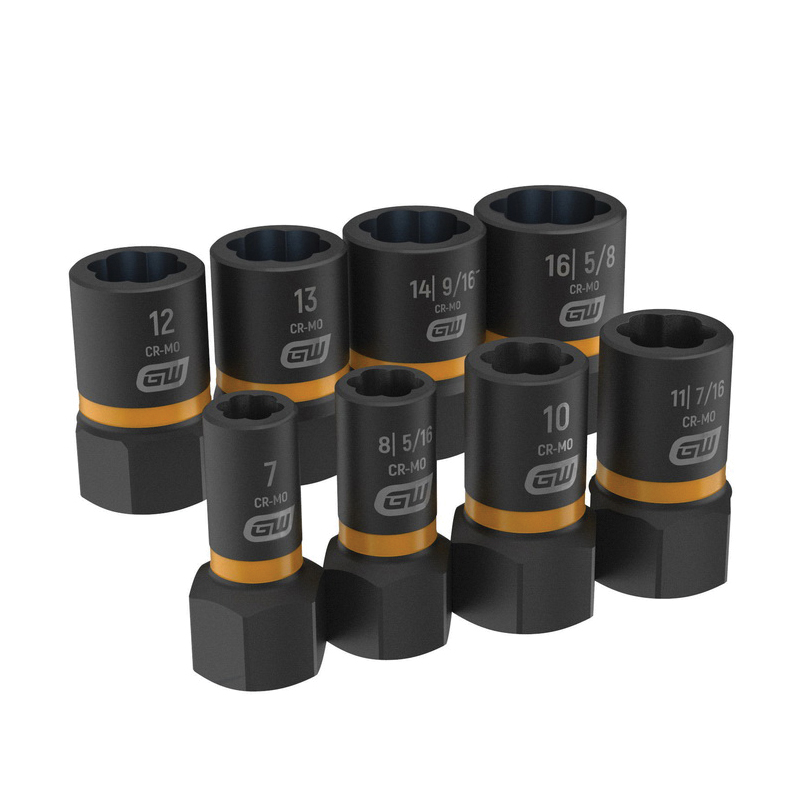 GEARWRENCH Extraction Socket Set, Standard Length, Yes Impact Rated, Measurement System: Metric/Imperial, 8 Piece, Included Socket: 5/16 to 5/8 in, 7 to 16 mm, 1/4 in, 3/8 in Drive, Rail Container, Chrome Molybdenum Alloy Steel, Black Oxide