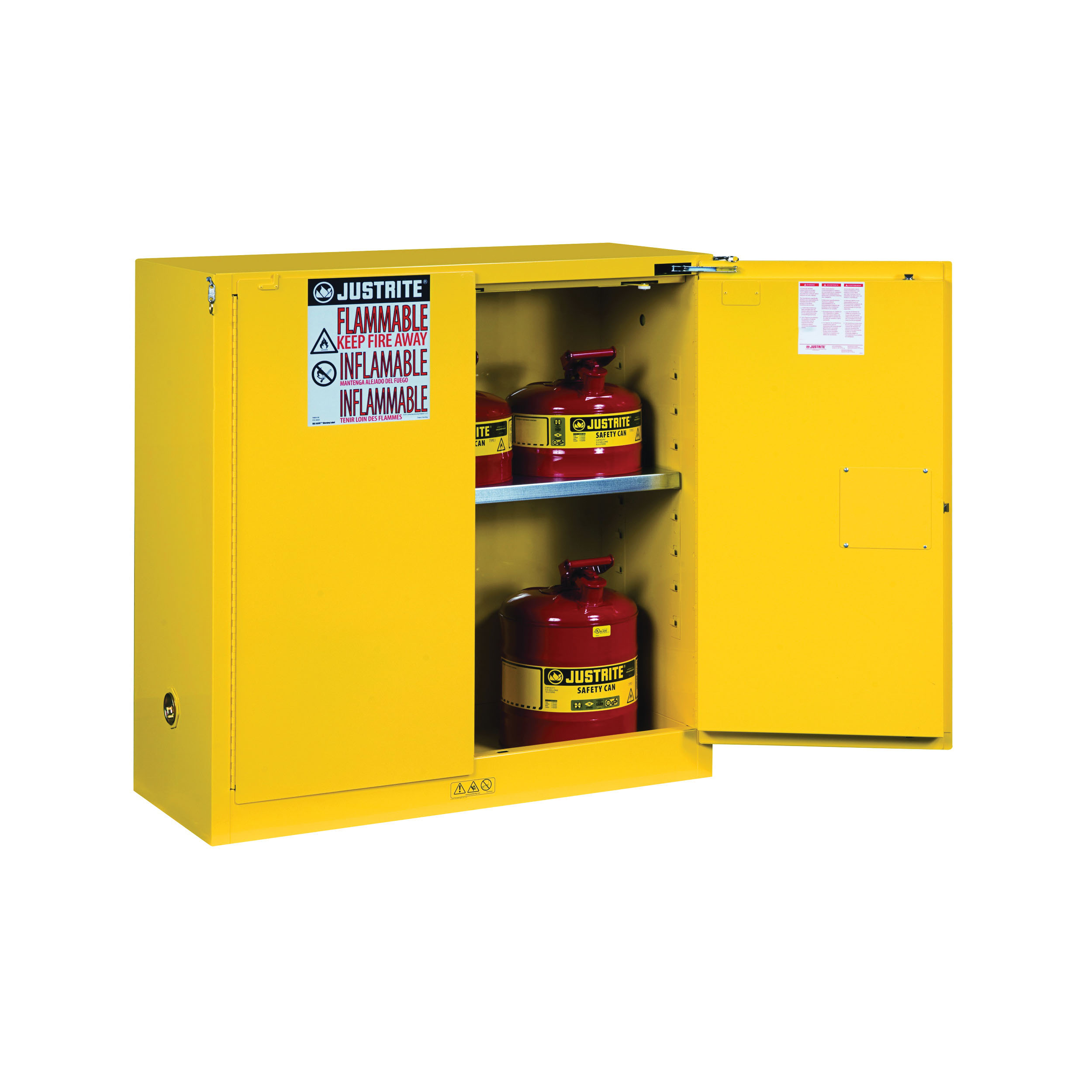 Justrite Flammable Safety Cabinet, Classic, Series: Sure-Grip EX, 30 gal Capacity, 44 in Height, 43 in Width, 18 in Depth, Self-Close Door, 2 Doors, 1 Shelves, Cold Rolled Steel, Powder Coated, Yellow, U-Loc Handle