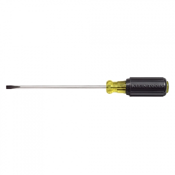Klein Cushion-Grip Screwdriver, Measurement System: Imperial, Cabinet Point, 3/16 in Point, 13-3/4 in Overall Length, Round Shank, 10 in Shank Length, Steel Shank, ANSI/ASME Specified Specifications Met, No Insulated, No ESD-Safe, Cushion Grip, Acetate Handle, Steel, Polished Chrome, Black/Yellow