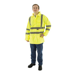 Majestic Glove Rain Jacket, Waterproof, Series: 75-1351, XL Size, Hi-Viz Yellow, Polyester/Polyurethane Coated Oxford Fabric, 28 in Chest, 33 in Back/27 in Sleeve Length, Zipper Closure, Specifications Met: ANSI/ISEA 107-2015 Class 3 Type R, Yes High-Visibility, 2 Pockets, Resists: Water