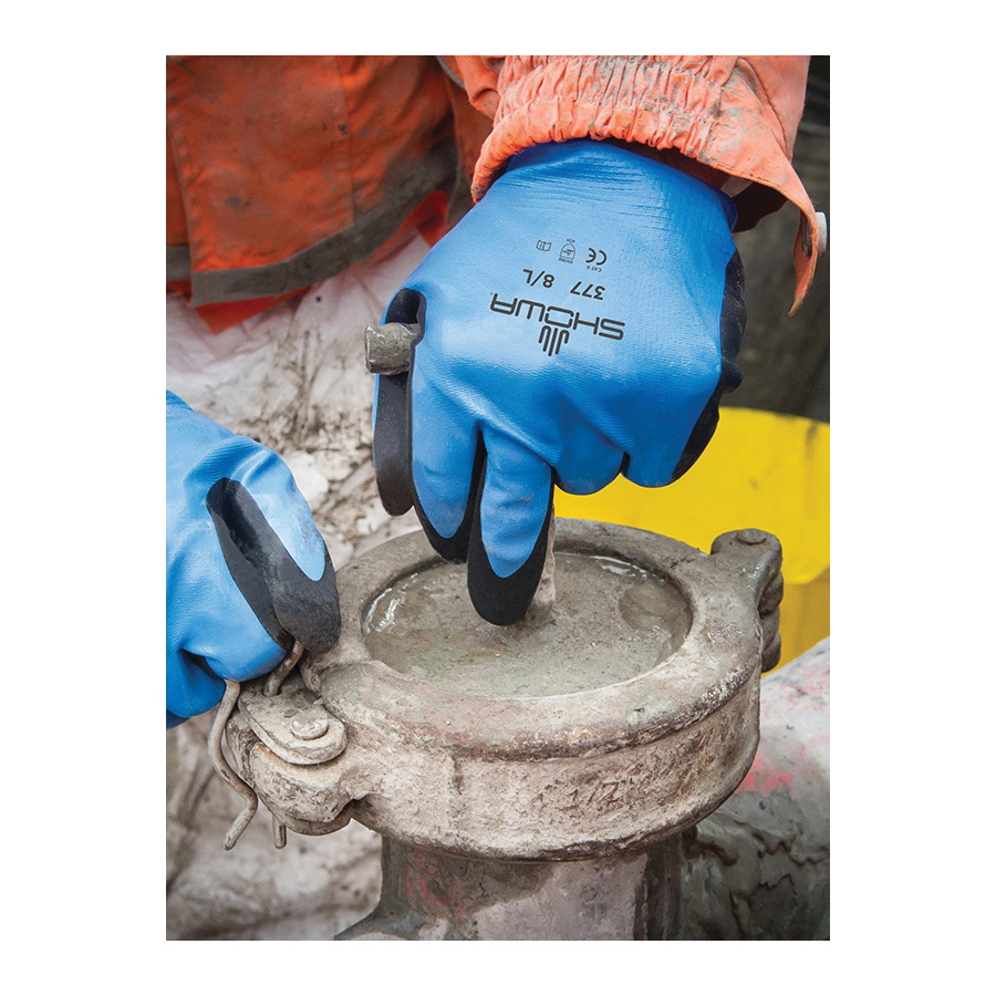 SHOWA 377M-07 Vend Ready General Purpose Gloves, Coated/Multi-Purpose, M/SZ 7, Foam Nitrile Palm, Nylon/Polyester, Black/Blue/White, Elastic/Knit Wrist Cuff, Foam Nitrile Coating, Resists: Abrasion, Blade Cut, Puncture and Tear, Seamless Knit Lining