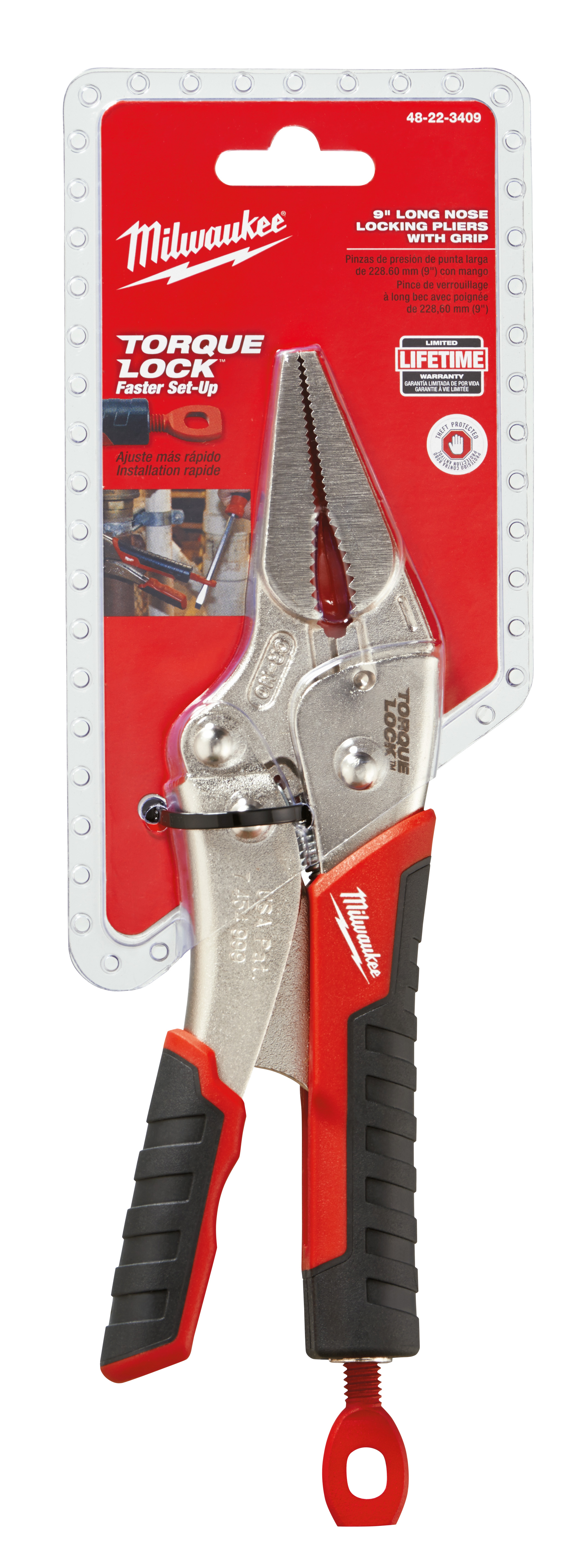 Milwaukee TORQUE LOCK Locking Plier, 2-1/2 in Nominal, Long Nose Curved Jaw, 2.11 in L x 3/16 in W Jaw, Forged Alloy Steel Jaw, 9 in Overall Length, Cutter Included: Yes, Non-Sparking: No, Comfort Grip/Ergonomic Handle, 4 in Handle Length, Polished Chrome, Black/Red/Silver