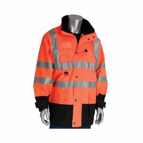 PIP Winter Coat, 7-in-1 All Condition, Series: 343-1756, Unisex Gender, L Size, Hi-Viz Orange, Polyester, 55-1/2 in Chest, 35 in Length, 190 gsm Fabric Weight, Zipper Closure, 11 Pockets, Resists: Water, Specifications Met: ANSI 107 Class 3 Type R