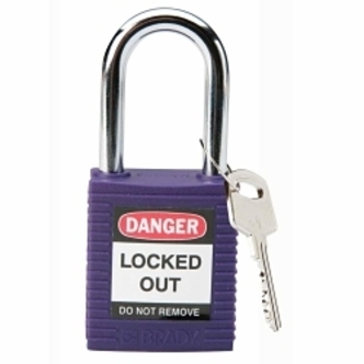 Brady Safety Padlock, Anti-Spark Key Retaining, Different Key, Purple, Fiberglass Reinforced Nylon Body, 1/4 in Shackle Diameter, 1-1/2 in Shackle Height, 0.8 in Shackle Width, Triple Coated Hardened Steel Shackle, 1-3/4 in Body Length, 1-1/2 in Body Width, 6-Pin Cylindrical Locking Mechanism, Legend: DANGER LOCKED OUT DO NOT REMOVE, Non-Conductive Conductivity