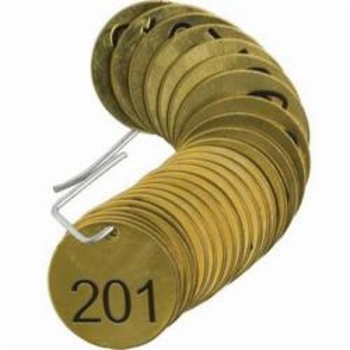 Brady Numbered Valve Tag, 1-Sided Circular Stamped, Legend: 201-225, Black on Brass Legend/Background, 1-1/2 in Height, 1-1/2 in Width, B-907 Brass, 0.188 in Hole