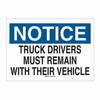 Brady Traffic Control Sign, Rectangular, Header: NOTICE, Text Legend, Legend: TRUCK DRIVERS MUST REMAIN WITH THEIR VEHICLE, B-401 Polystyrene, Corner Hole/Surface Mounting, 10 in Height, 14 in Width, Black/Blue on White Legend/Background