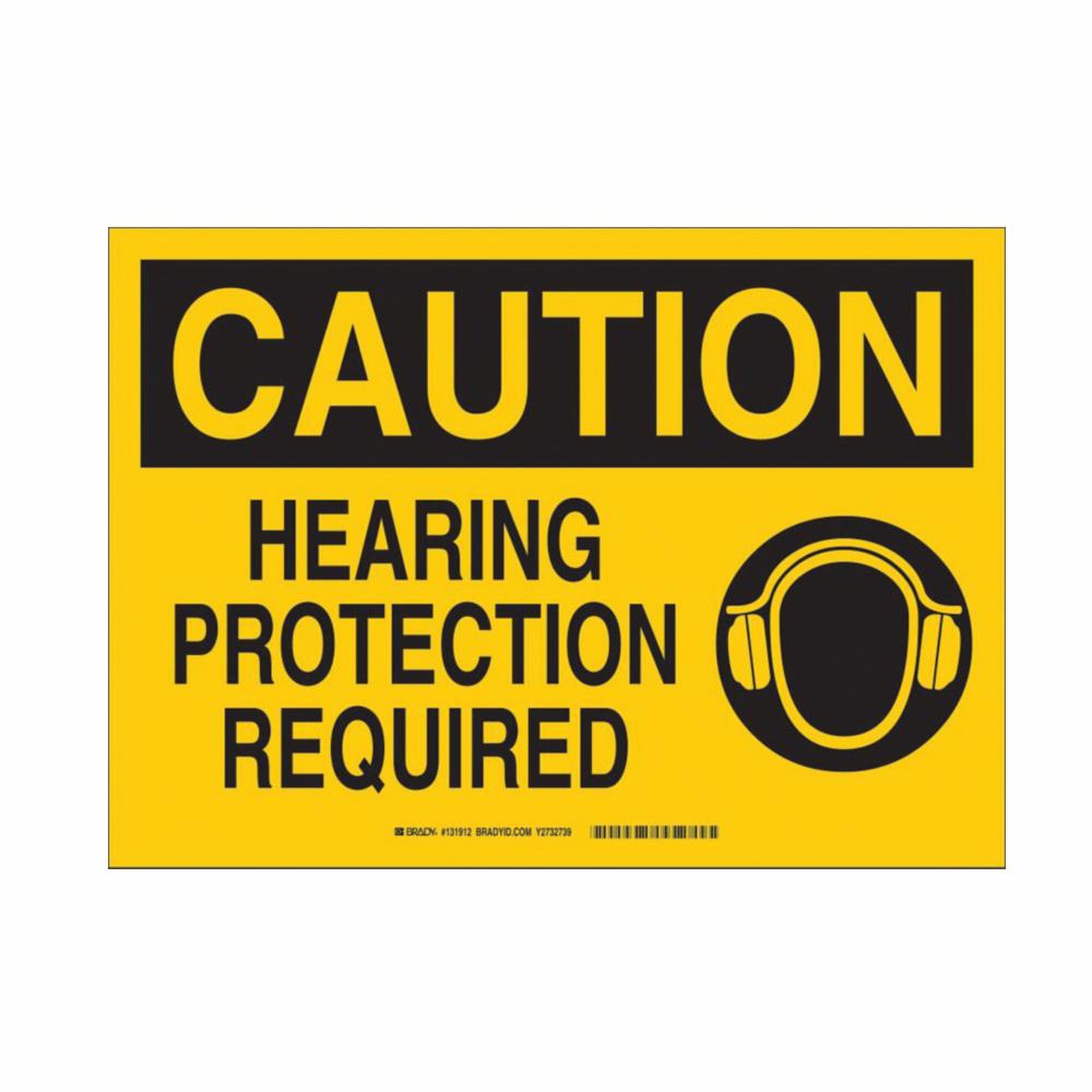 Brady Personal Protection (PPE) Sign, Rectangular, Header: CAUTION, Symbol/Text Legend, Legend: HEARING PROTECTION REQUIRED, B-555 Aluminum, Corner Hole Mounting, 10 in Height, 14 in Width, Black on Yellow Legend/Background