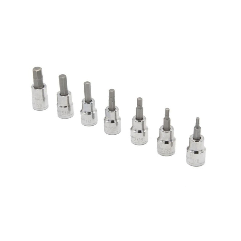 Includes1/8 in, 5/32 in, 3/16 in, 7/32 in, 1/4 in, 5/16 in and 3/8 in SAE 3/8 in Drive Hex Socket Bits