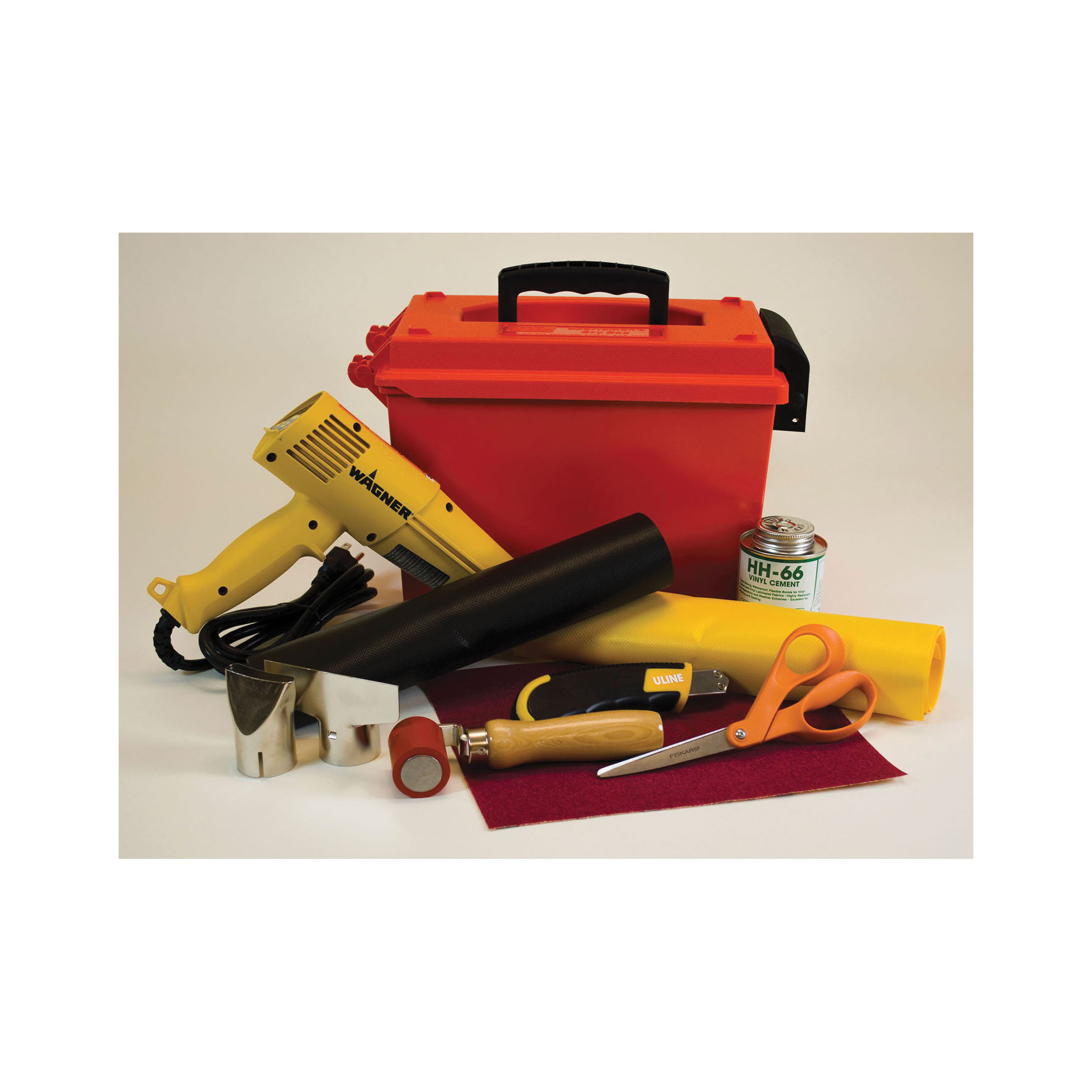 IncludesHeat Gun and Nozzle, Scissors and Utility Knife, Pressure Application Roller, PVC Cement, Sand Paper, 5 sq-ft Yellow PVC Coated Repair Material and 5 sq-ft Black PVC Coated Repair Material
