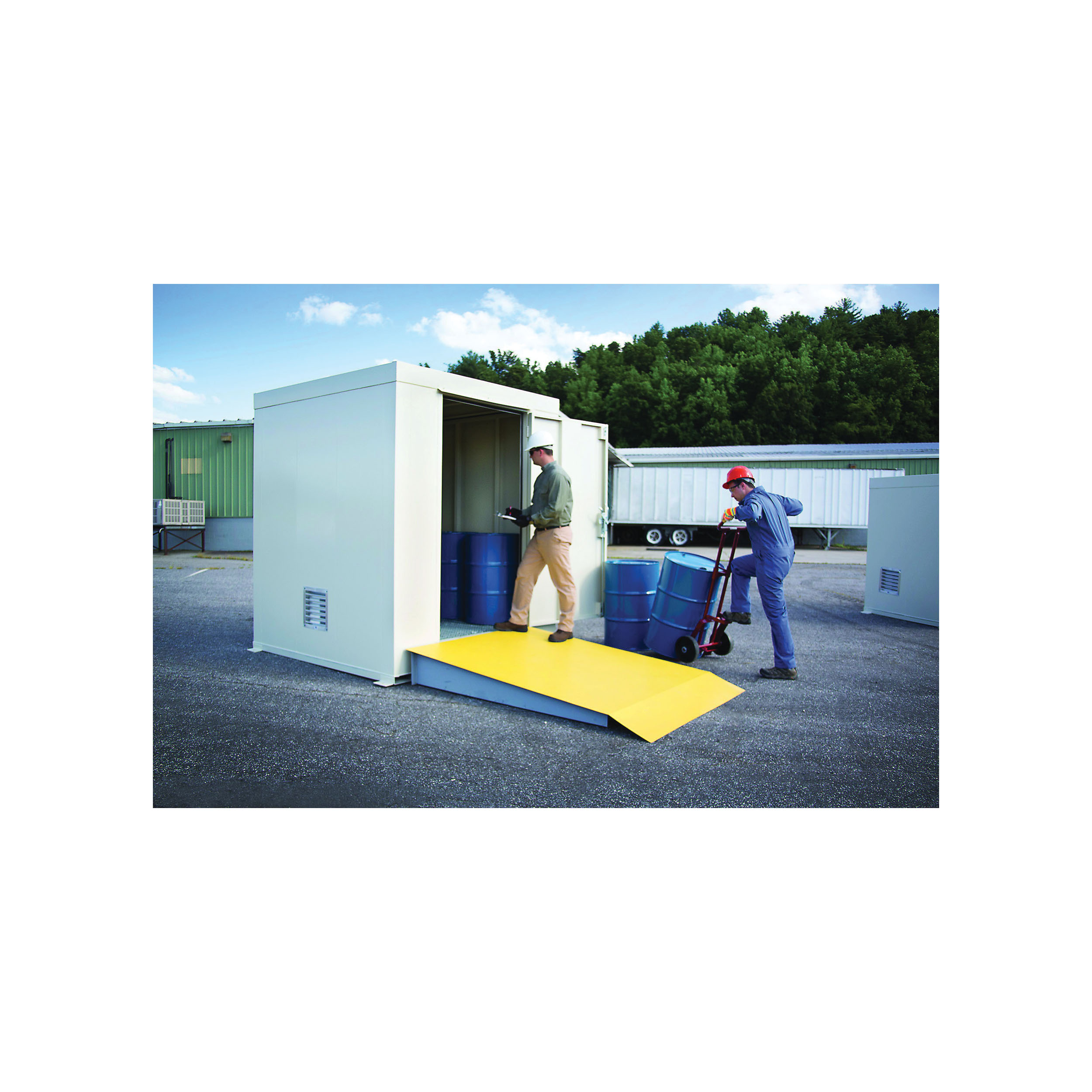 Justrite Outdoor Safety Locker, Non-Combustible, (9) 55 gal Drum, 9000 lb Load, 198 gal Sump, 97 in Height, 84 in Width, 84 in Depth, Standard Door, 1 Door, Heavy Gauge Steel, Bone