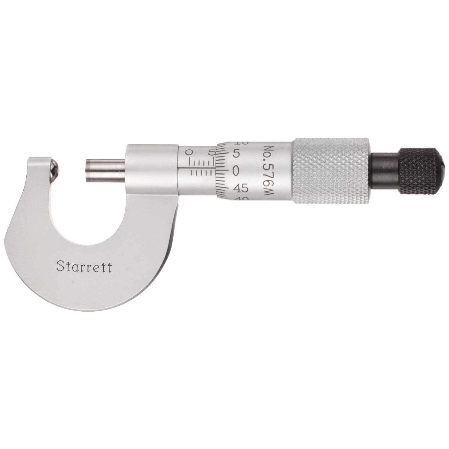 Starrett Outside Micrometer, Mechanical, Series: 576M, 0 to 13 mm, Graduations: 0.01 mm, 0.01 mm Resolution, Round Anvil, Flat Spindle, 0.2 in Spindle Dia, Ratchet Thimble, Carbide Tip, Satin Chrome, 3-25/64 in L x 17/32 in W x 1-25/64 in H