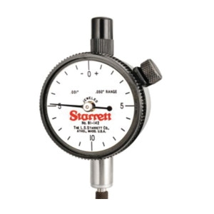 Starrett Dial Indicator, AGD Group 1, Series: 81 Series, 0.05 in, 0 to 10 to 0 Dial, Graduations: 0.001 in, 1-11/16 in Dial, White Dial, 13/64 in Dia Tip, Stainless Steel, Satin/Eggshell