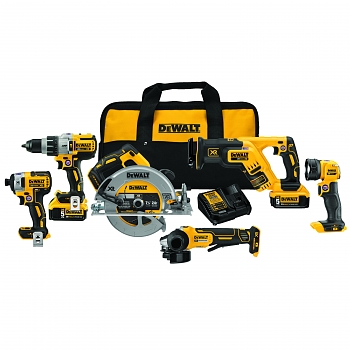 IncludesMAX XR DCD996 20 VDC Hammer Drill/Driver, MAX XR DCS570 20 VDC Impact Driver, MAX XR DCS570 20 VDC Circular Saw, MAX XR DCS367 20 VDC Compact Reciprocating Saw, MAX XR DCG413 20 VDC Angle Grinder, DCL040 Bright Flashlight and (2) Batteries