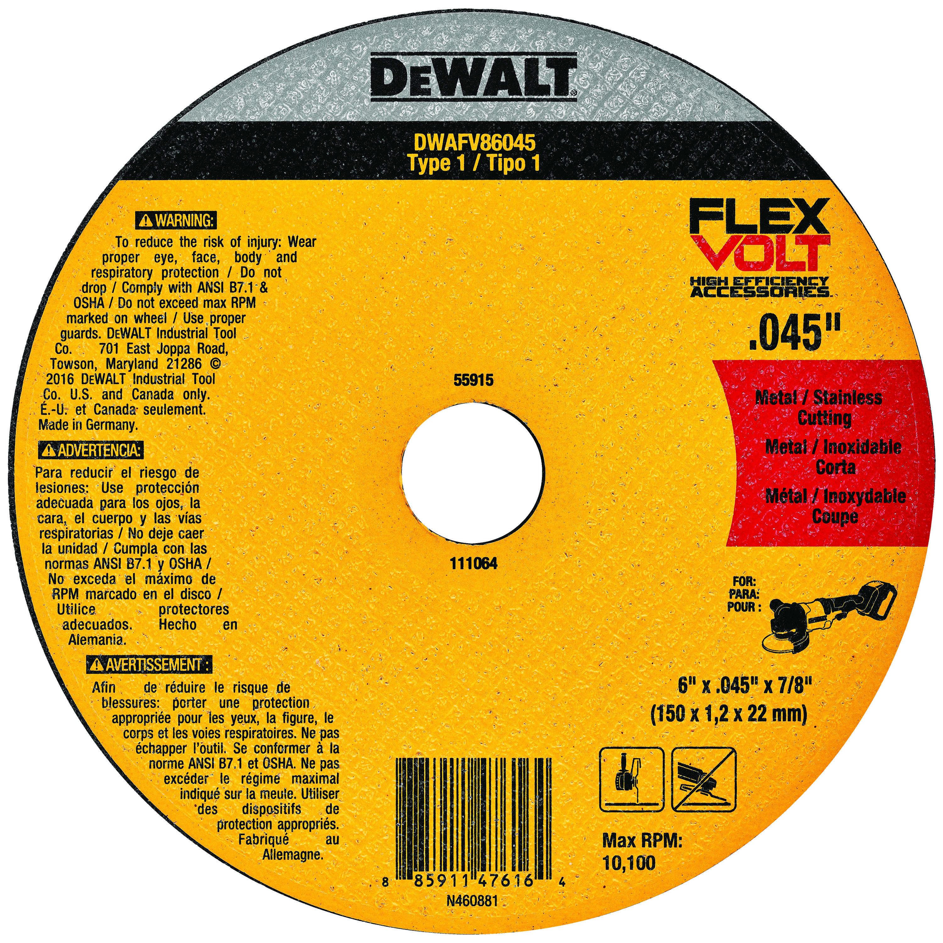 DeWALT Cut-Off Wheel, Small Diameter, Series: FLEXVOLT, 6 in Wheel Dia, 0.045 in Wheel Thickness, 7/8 in Center Hole, 24 Grit, Ceramic Abrasive, 10100 rpm Maximum, Resin Bond, Applicable Materials: Stainless Steel, Wheel Type Number: Type 1, For Use With: Portable Tools, No Reinforced, ANSI Specified Specifications Met
