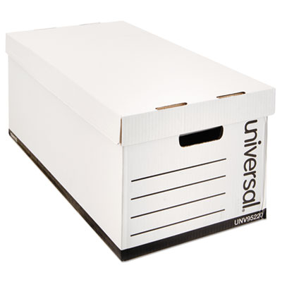 Double-walled construction on all panels increases stacking and carrying strength. Designed to stack two on a shelf. Smooth rolled edges eliminate paper cuts. Large tote handles for portability.